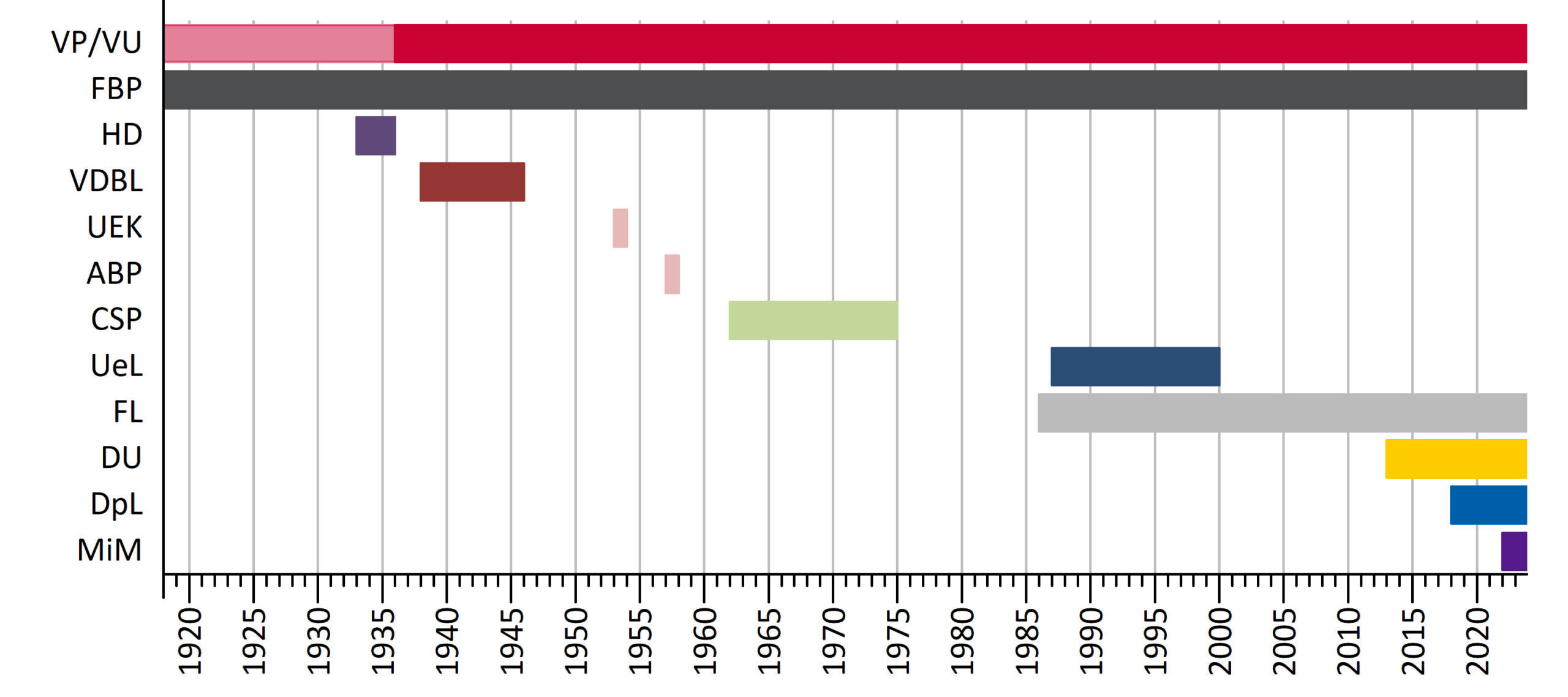 In Liechtenstein wurden die ersten beiden Parteien erst 1918 gegründet: die Christlich-soziale Volkspartei (VP) und die Fortschrittliche Bürgerpartei (FBP). Diese lieferten sich in den 1920er- und 1930er-Jahren heftige Parteienkämpfe. Zunächst dominierte die von Wilhelm Beck gegründete Volkspartei, aber der Sparkassaskandal 1928 leitete die Vorherrschaft der FBP bis Ende der 1960er-Jahre ein.
