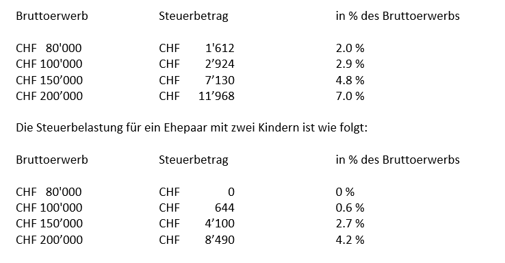- Wie hoch ist die effektive Steuerbelastung für ein Ehepaar ohne Kinder und für ein Ehepaar mit zwei Kindern bei einem Erwerbseinkommen von CHF 80’000, CHF 100’000, CHF 150’000 und CHF 200’000?